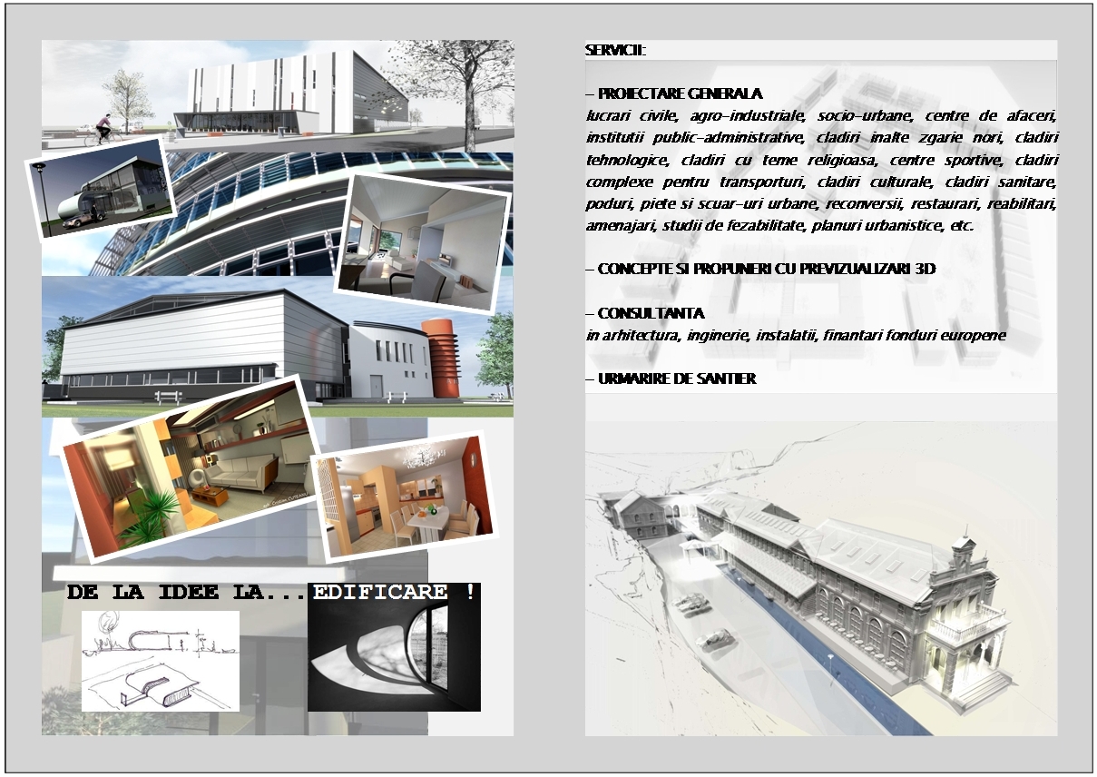 Tinta noastra este satisfacerea clientilor de la prima solutie de arhitectura pe care o furnizam. Dorim sa atragem cat mai multi investitori prin calitatea serviciilor, prin unicitate, durabilitate si sustenabilitate, intelegand ca putem economisi inca din proiectare multe procente din valoarea de investitie efectiva, reusind a eficientiza efortul financiar spre a marii castigurile finale.